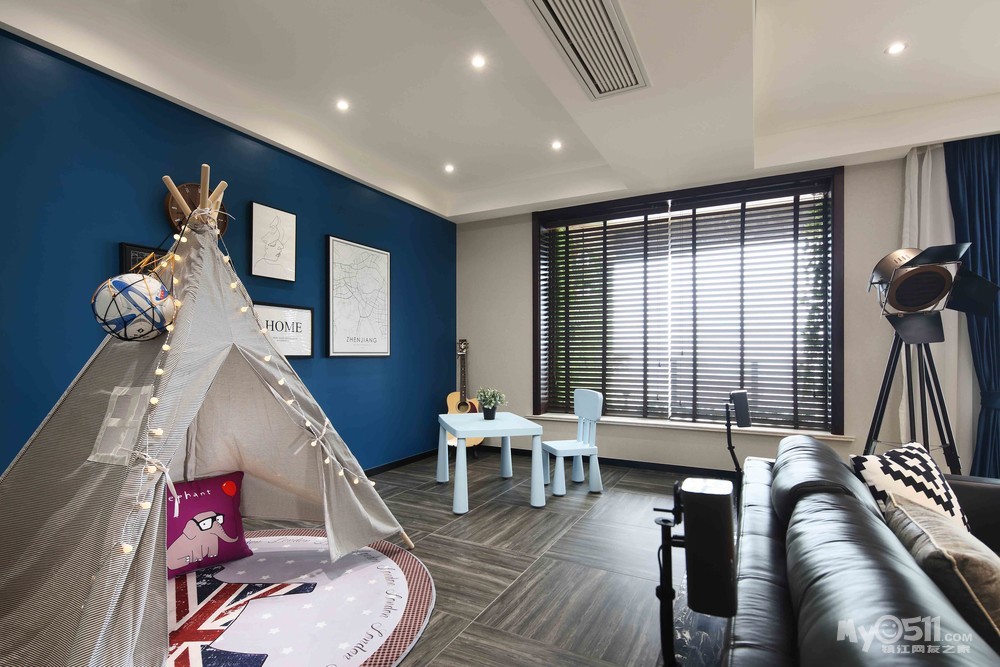 很多这个户型的都把地台这块做成了书房,可是我觉得大house,就应该做大,没有玄关没有遮挡,虽然没有玄关,但是进门俨然看不到任何一个卧室的门,地台自然就成了小主人的天地了。电视也没有用寻常的液晶和幕布,而是选择硬屏(用男主的话就是为了装B,哈哈)。孔雀蓝黑板墙的挂画也是挑了好几回,最终确定了这四幅还是有点意义的。