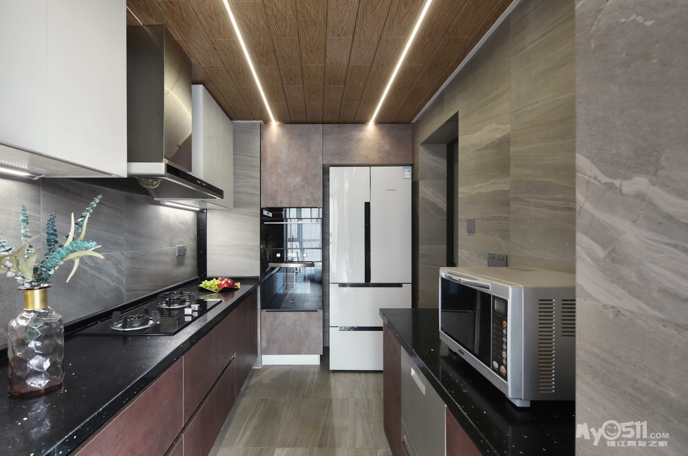 厨房也属于细长型,这里的吊顶和吊顶的长条灯要夸一夸男主了,那时候几乎不上班都泡在材料市场,发现好东西就发给我看,千奇百怪的东西都能被他找到,这个灯一开始还怕亮度不够,结果发现是我们多想了。厨房的装备也很齐全了,洗碗机,蒸汽箱,烤炉。。。。。。