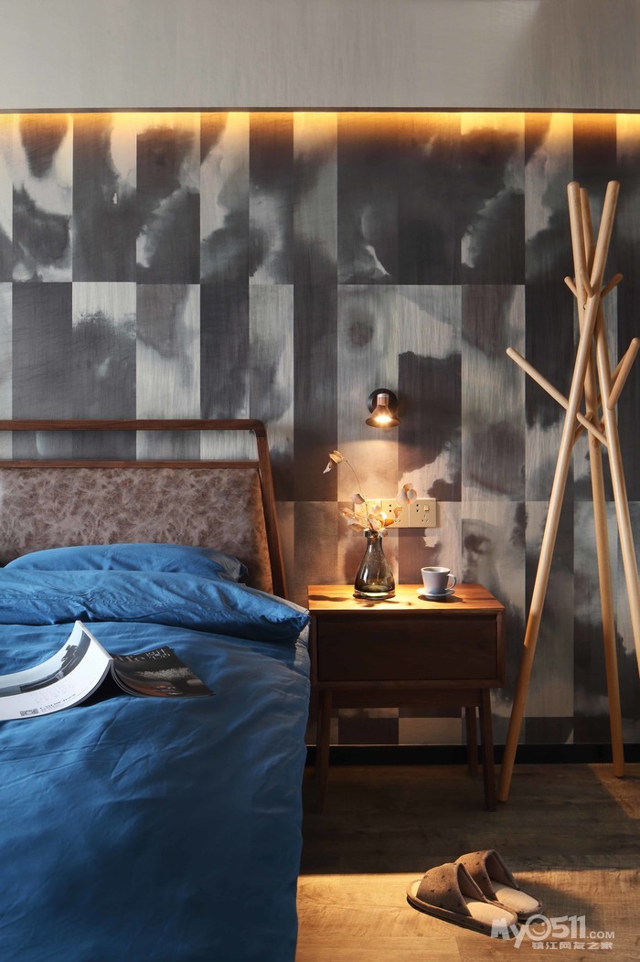 主卧室做了一个大套房(书房,卫生间,化妆洗漱区),背景墙纸风格大胆,感觉很棒主卧地板也很有个性,一问,欧家进口强化