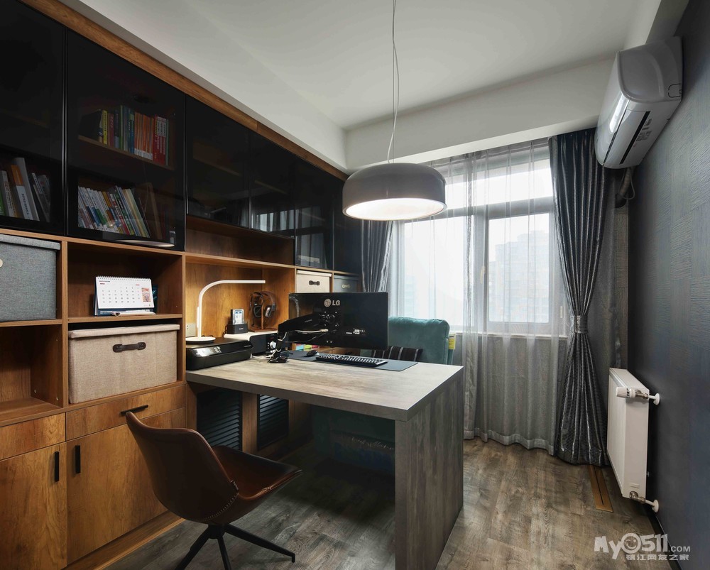 主卧套间里的书房,麻雀虽小五脏俱全。自己家书房也不大,看了业主的这个小书房,顿时有了信心。很多人看图片不一定看出特别之处。 那就是看不到线,我看了下现在自己书桌背面,那些电线乱七八糟,惨不忍睹呀。桌面中间是空的,面底都12厘板(可能是9厘,记不清),两层板中间打的木楞架空,线全部走桌子中间走,进设备柜(黑色百叶门那个)。