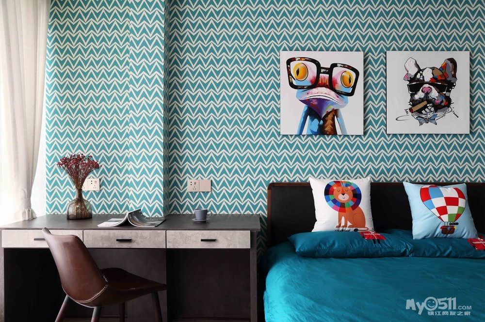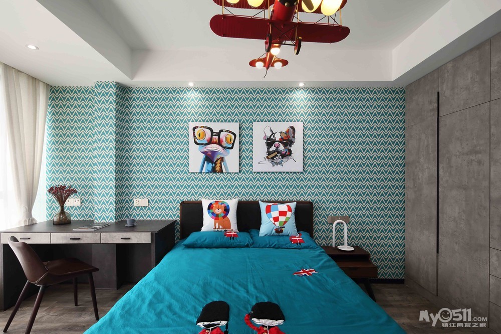 这个小主人的卧室,色彩上选择比较活泼,床同样也是commune, 一步到位。不过抱枕,挂画,吊灯都还是以卡通为主,毕竟他还是个可爱的小朋友。
