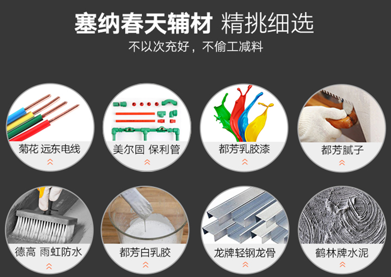 塞纳春天的材料采用F2C模式(工厂到消费者),通过省去中间环节,降低主材价格,零中间商,价格透明,质量有保障。