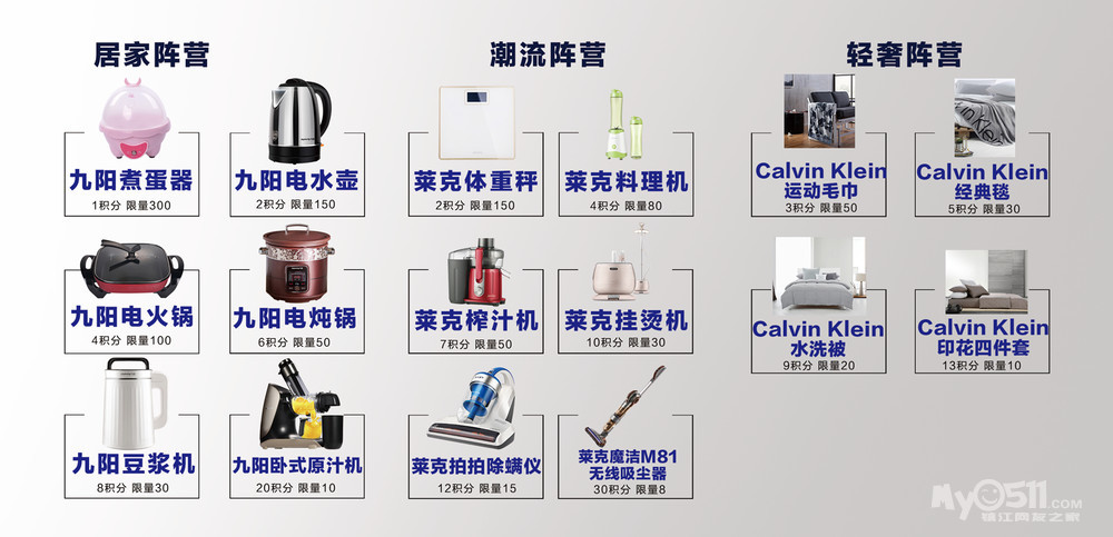 活动期间,顾客在商场购买家具建材,参与统一收银,单张订单实付每满5000元即送1积分,以此类推,多买多送,多张订单不累计。顾客可从商场礼品领取处三大礼品阵营挑选礼品,消耗对应阵营积分完成兑换。
