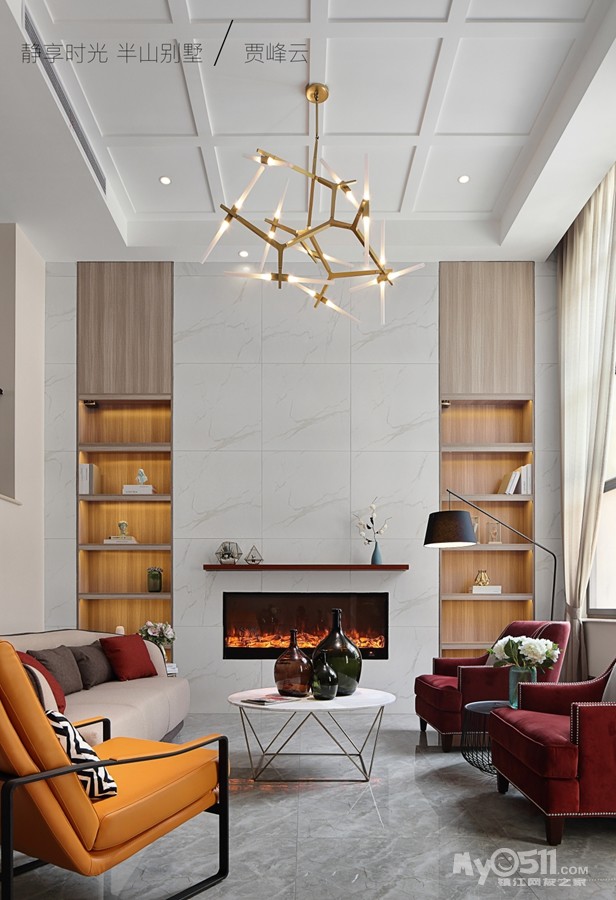 错层挑高的空间用金色艺术吊灯来雕刻生活美学方格吊顶设计避免空间的单调