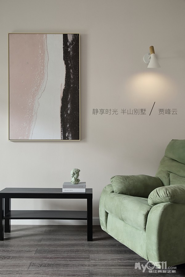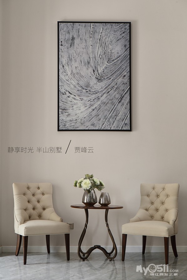 边厅设计了休息区品鉴艺术 思想交流抽象画暗示了业主自由不鹜的心灵