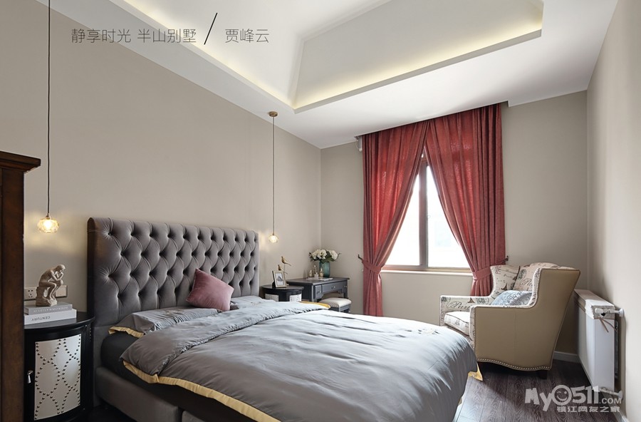 卧室格调优雅米灰床具配以红色麻布窗帘为安静的休息空间增添些许私密感