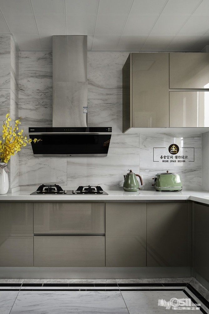 香槟金为主色调的厨房,墙面以淡雅的砖过渡营造层次感,破开了烤漆面橱柜的沉稳感,达到视觉的平衡。
