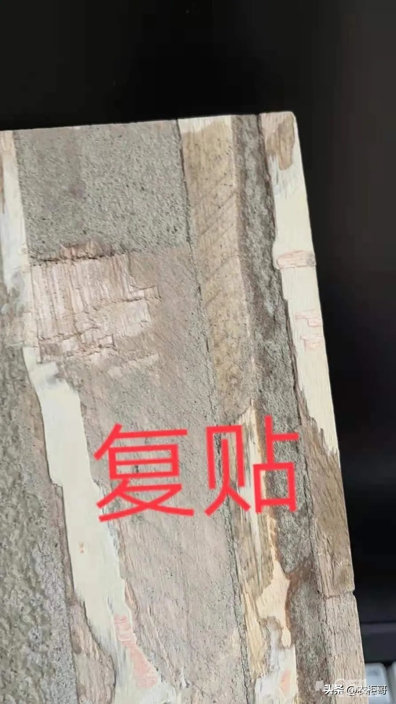 不急,衣柜哥教你一招:特别简单!泡水!取一小块,连续泡几天水,直贴的基本上不会脱层,而复贴的会脱层!且脱层的地方,闻得到胶臭味!简单吧!