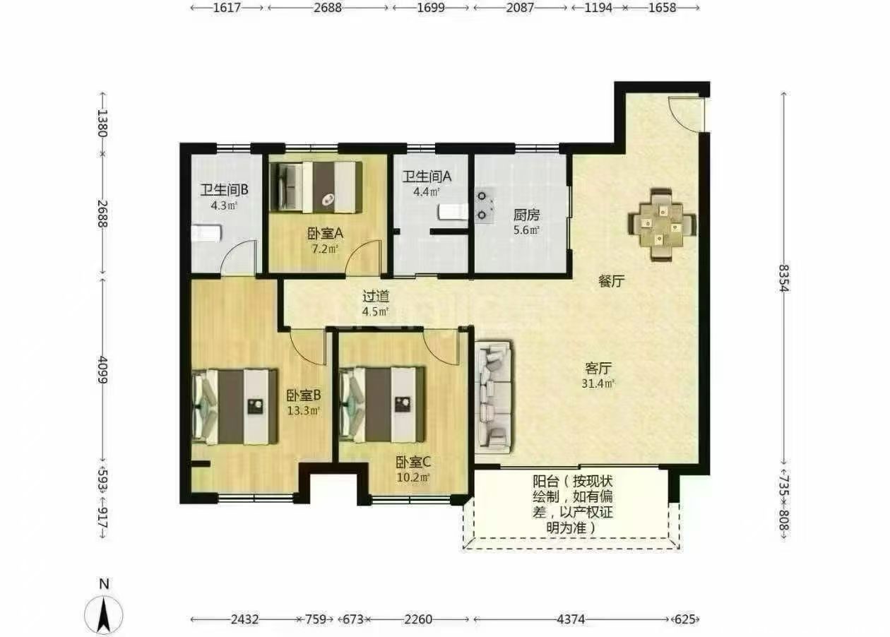 万达商圈 三室二厅 103平边户全明户型 自装带个小院子