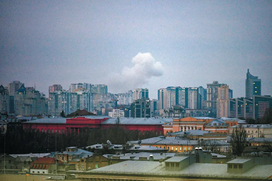 25日,乌克兰首都基辅再次遭到俄导弹和无人机袭击,基辅上空升起浓烟。(视觉中国)