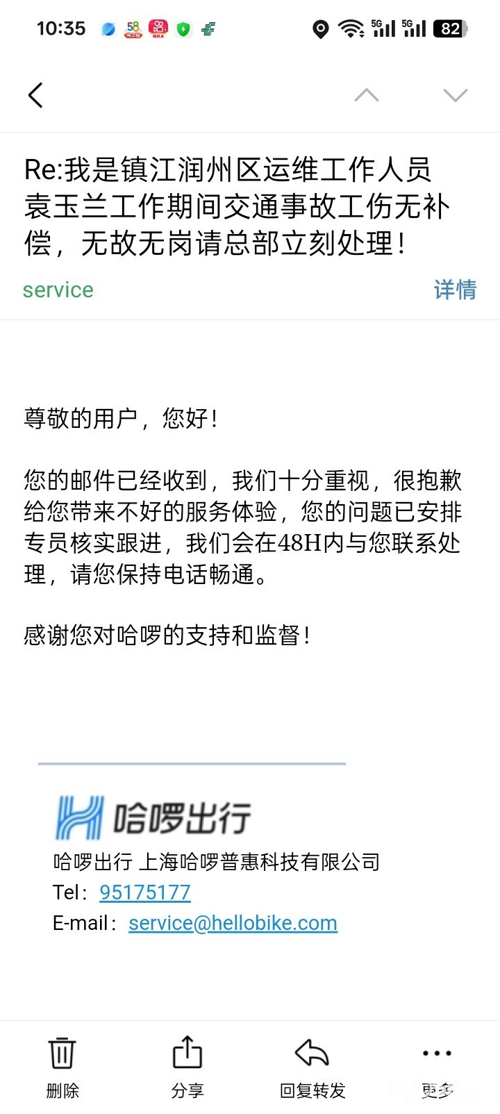 百姓话题  >  [百姓心声] 镇江润州区哈啰运维老员工工伤被甩锅,求本地人关注!