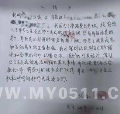 网帖中附有一份手写认错书,该女子在文中表示,自己“为了挣路费去考试,提前预订了毕节七星关区多个考点的多家酒店房间,想高价转给其他考生,导致考区周围的酒店价格上涨,损害了酒店商家和其他考生的正当权益”。