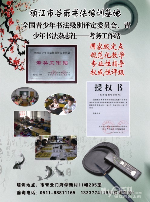 [★常年为镇江青少年书法爱好者提供免费评级服务(仅全国青少年书法评委会专家收取评审费50元/次)。如需评级作品指导,本考务站则根据作品考级的高低,收取相应费用(内部学员免费指导)。 ★地址:镇江市青云门府学新村11幢205室 垂询电话:0511——88811165 13337741165 ★书法培训班(毛笔字、钢笔字、铅笔字) 招生:学龄前儿童、大中小学生(8人左右小班教学)