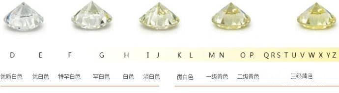 按照GIA国际标准,把钻石成色从高到低分为:DEF,GHIJ,kLM,NOPQRSTUVWXYZ,越往后颜色越黄,同等参数下,价格也越低,不过一旦过了Z级,就是彩钻黄钻了,价值就会提升。