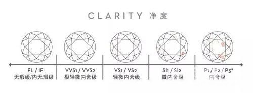 钻石的净度依据内含物质的位置、大小和数量的不同来划分,由高到低详细分为FL,IF,VVS1,VVS2,VS1,VS2,SI1,SI2,SI3,P1,P2,P3.在十倍放大镜下仔细观察钻石洁净程度,瑕疵越多,所在位置越明显,则质量越差,价格也相应要降低。
