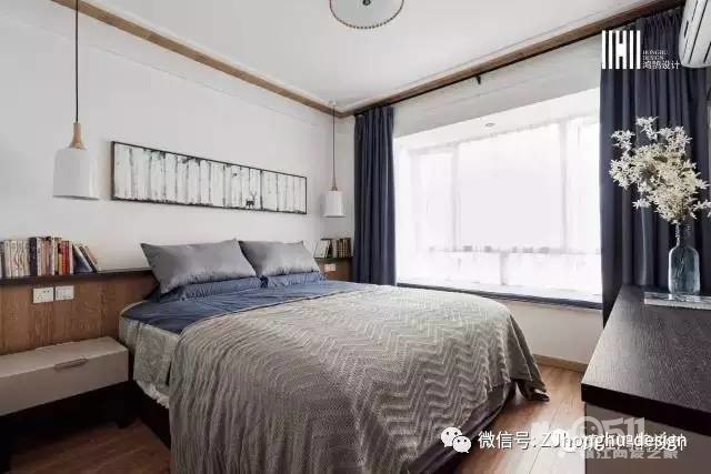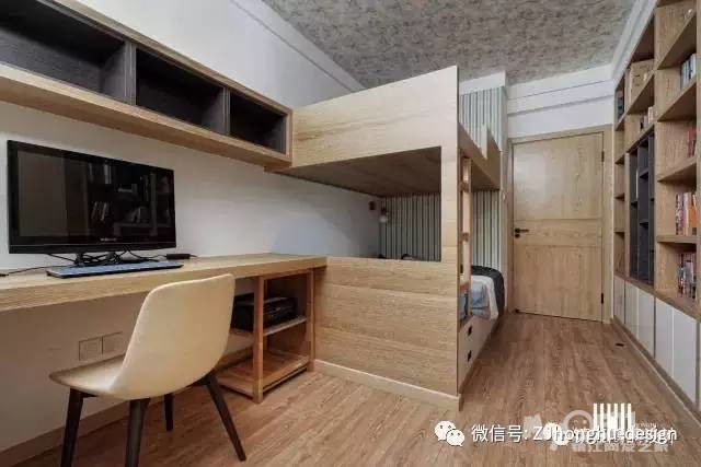 女人喜欢浪漫、幻想,主卧飘窗的搭配上运用了蓝白色,闭上眼仿佛置身天空;小孩房大面积书架可以看的出来,小朋友一颗热爱读书的心。