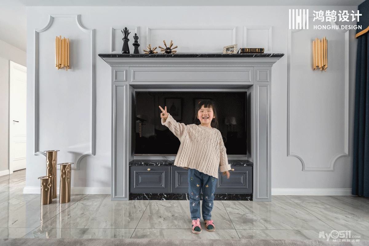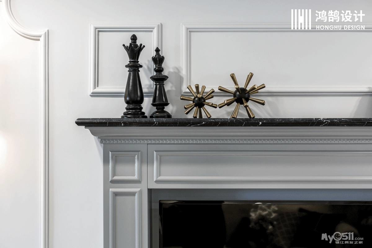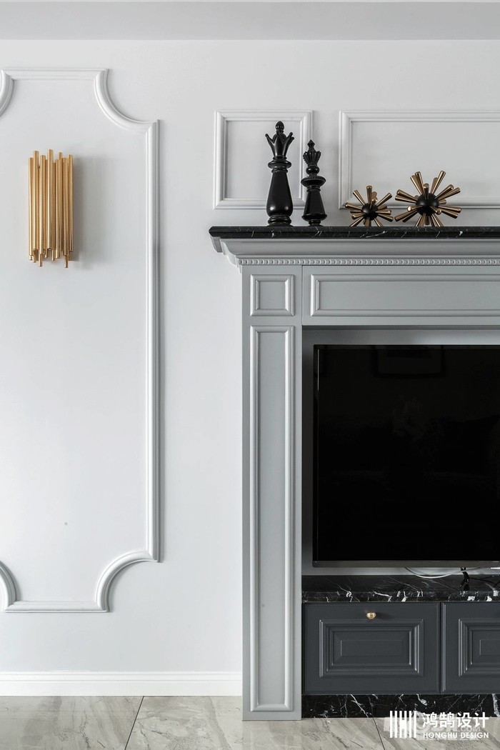 电视背景墙采用美式壁炉造型,在下方设置了收纳柜,保证美观的同时又兼具了收纳的功能。壁炉上摆满小饰品,为空间增添了美感。