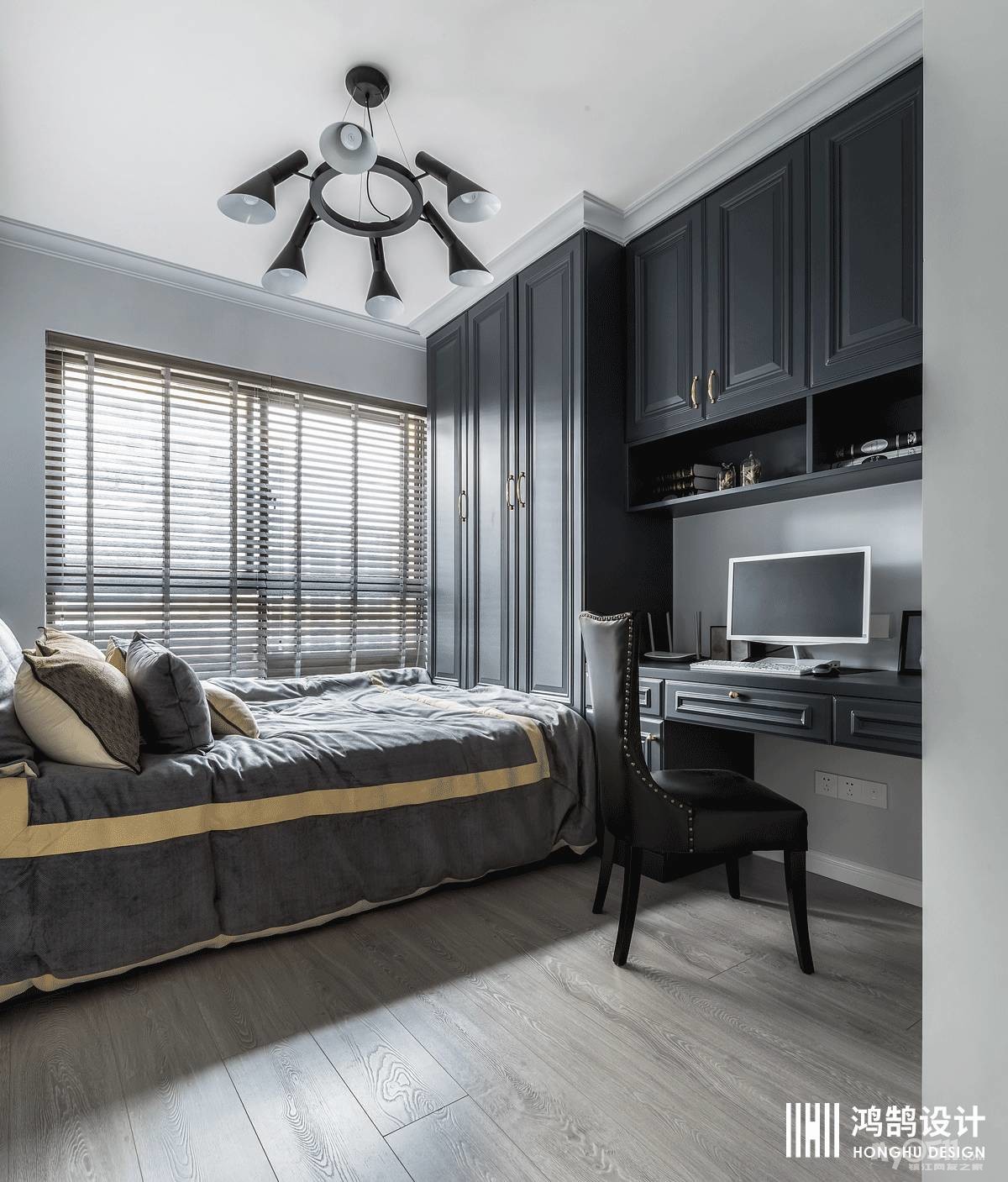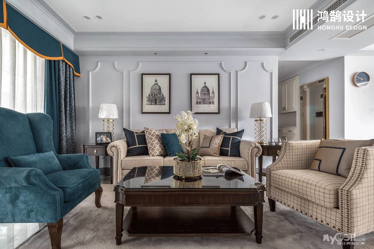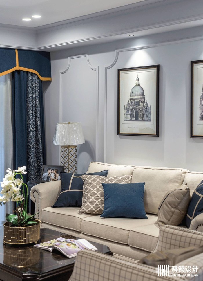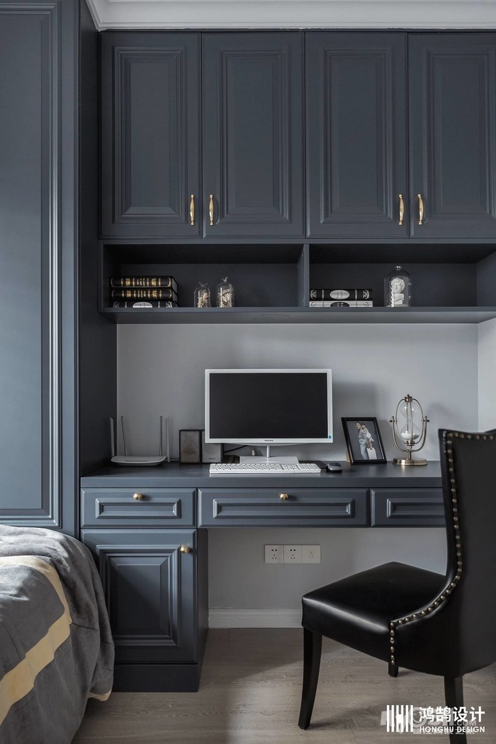 灰蓝色的墙面搭配美式线条做背景,在清爽的氛围中,咖色的家具和蓝色系的软装使整个空间复古而又沉稳。