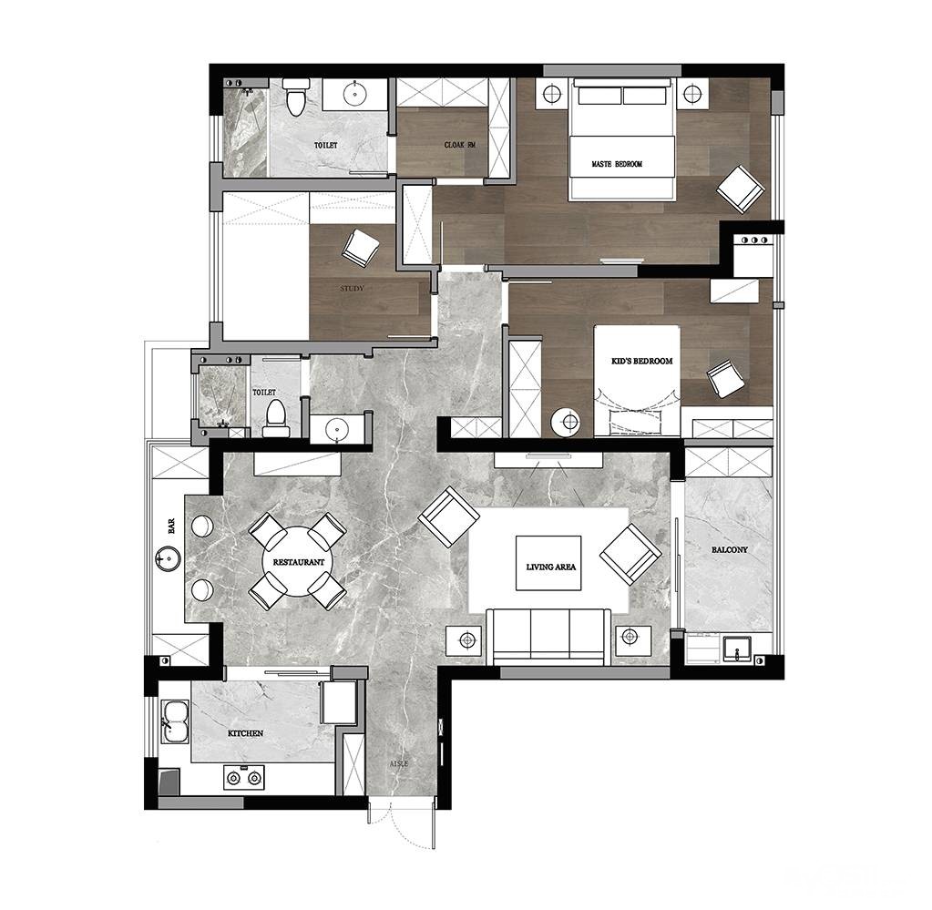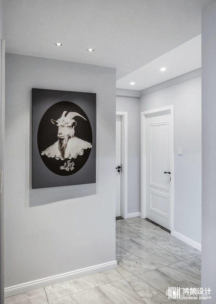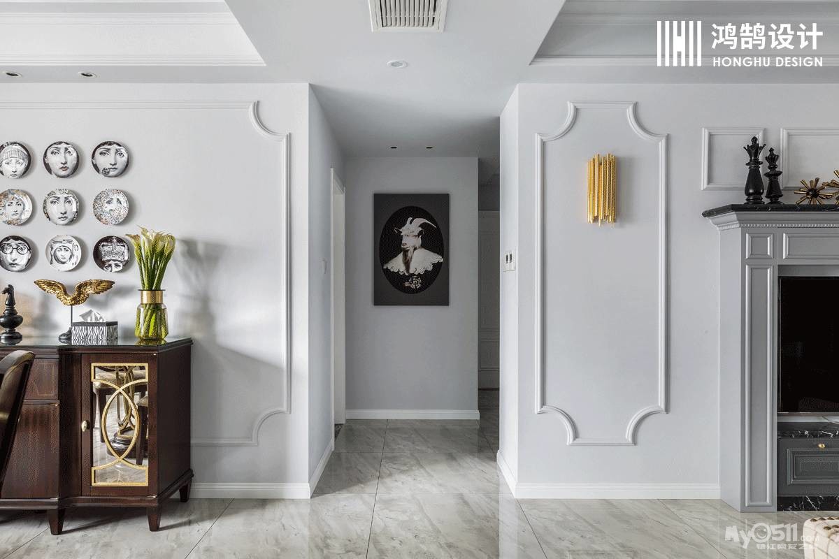 客户除了需要常规的主卧、儿童房之外,还需要一个有个人工作空间的书房。平面规划上,设计师在保证客餐厅南北通透中轴对称外,拓宽了公共空间的过道让其达到标准合理的尺度,增加了南面的儿童房面积,也扩充了北面书房的功能。