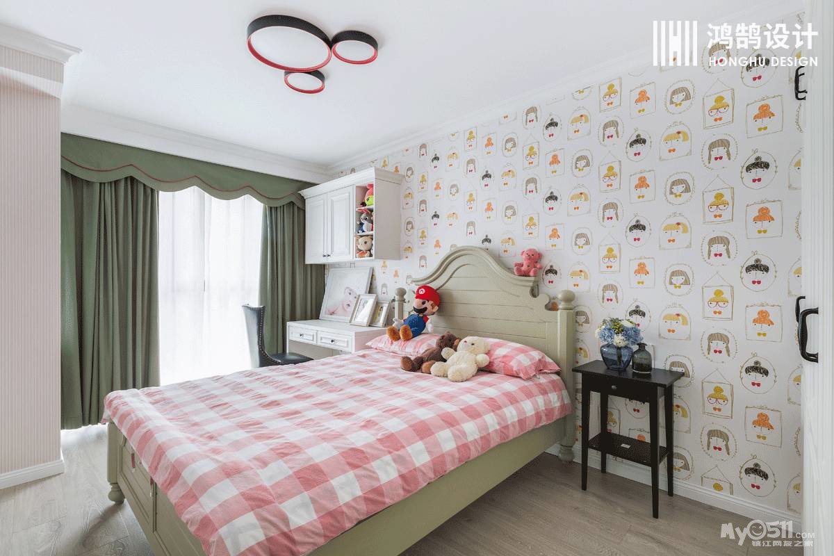 儿童房采用造型简单的美式床搭配薄荷绿的窗帘,在软装上加入一些卡通元素,更加活泼。