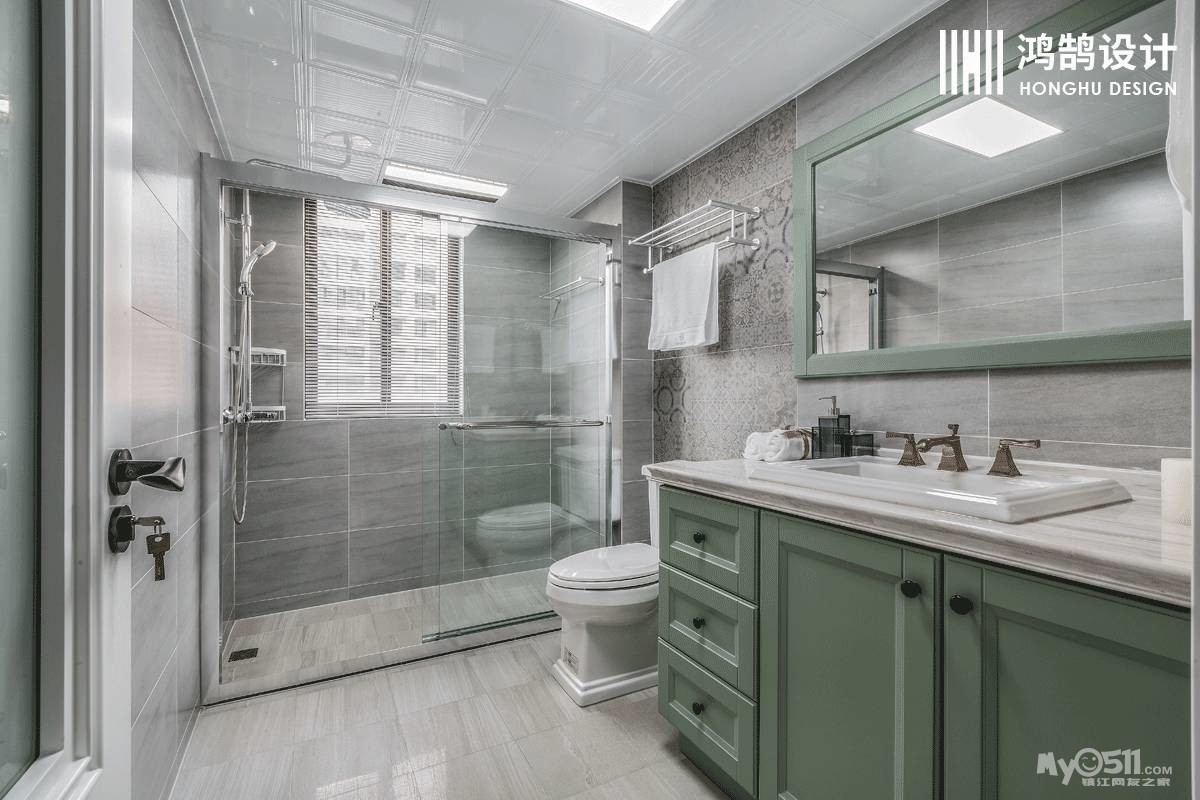 薄荷绿,好似浅浅的湖水,搭配灰色的墙地砖,让卫生间散发出清新气息。