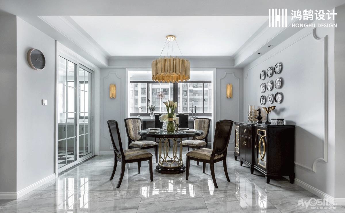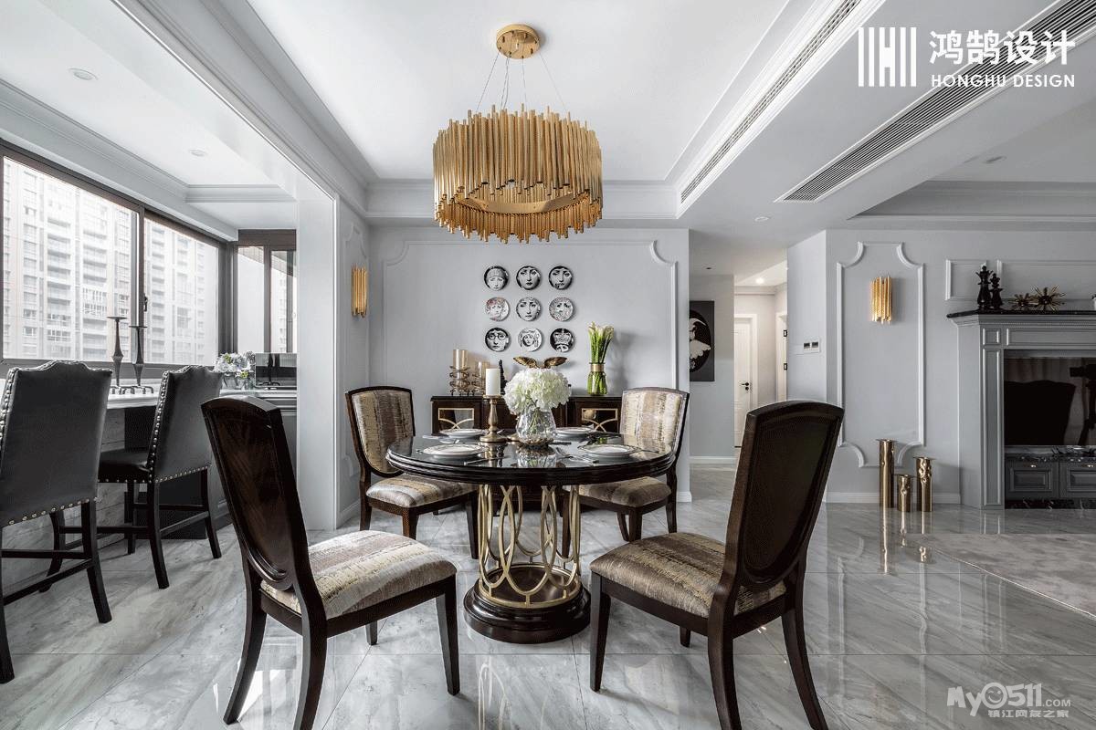 餐厅设计师采用了圆桌 ,增进就餐者之间的距离,搭配金属吊灯,低调的奢华质感油然而生。