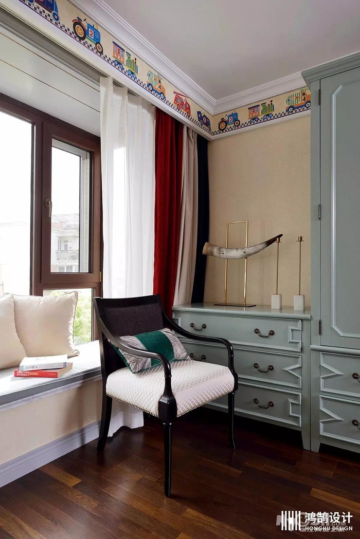 儿童房采用造型简单的美式床搭配薄荷绿的窗帘,在软装上加入一些卡通元素,更加活泼。