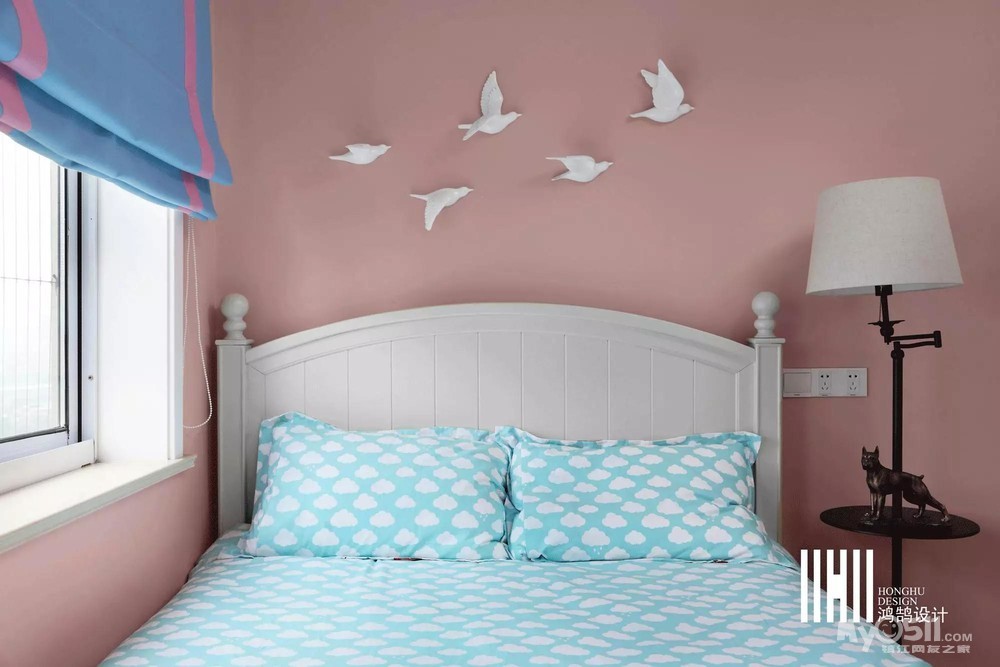 梦幻的粉色和清新的蓝色搭配,左边衣柜,右边书架,双床头柜,床下收纳,满满的收纳。