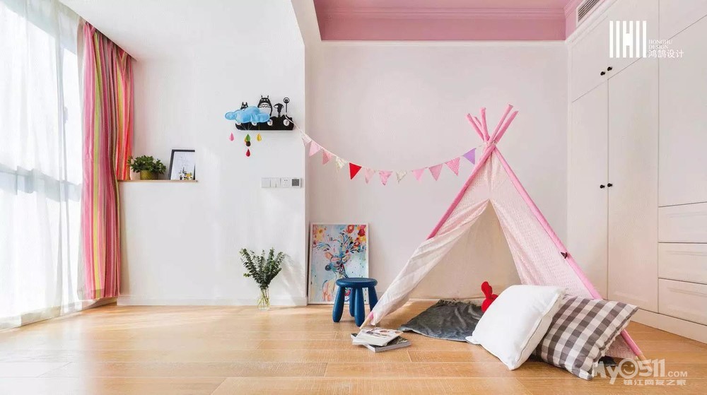 儿童房较为粉嫩,粉色小帐篷的创意设计,童趣满满,给孩子更多的想象空间,一整面墙的衣柜,满足日常储物需要。