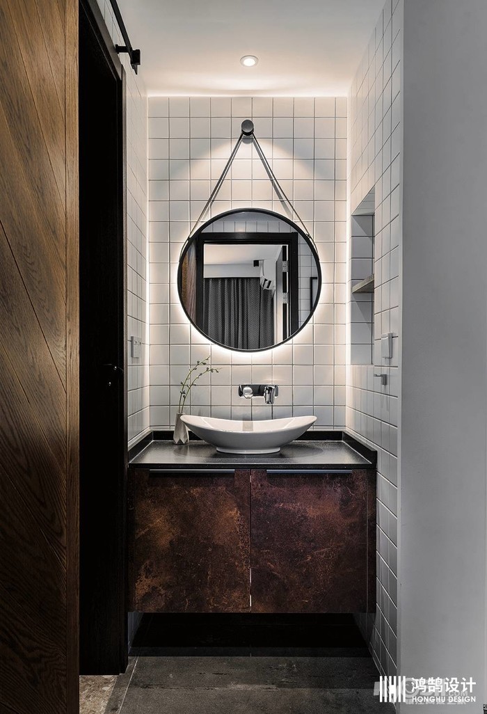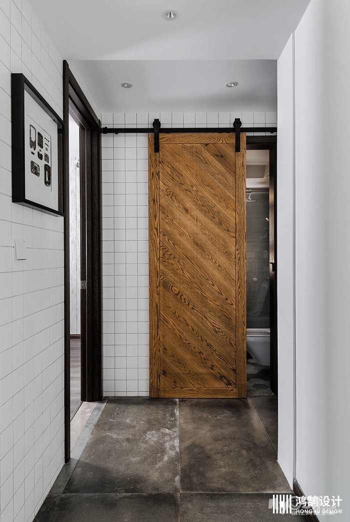 卫生间的门采用的是仓谷门的设计,让人眼前一亮,白色小方砖利落的布满干区。