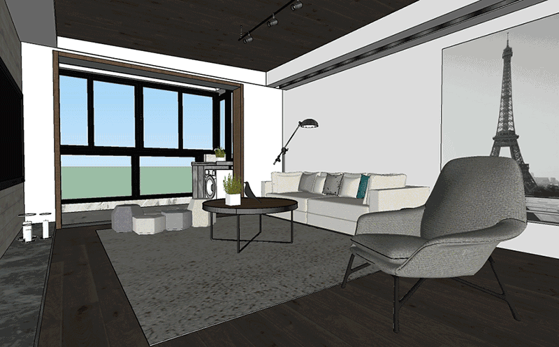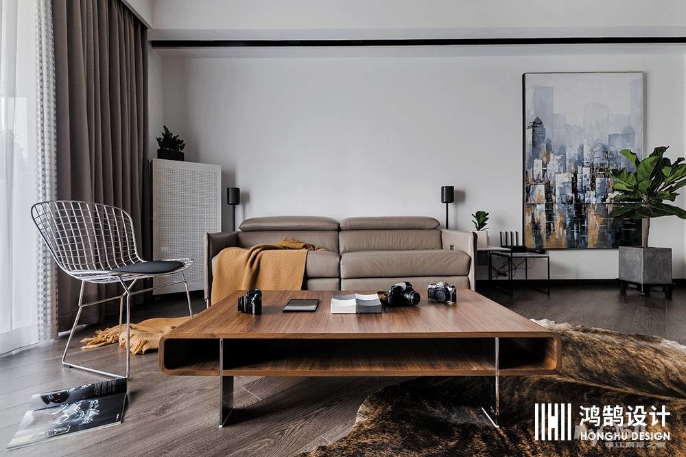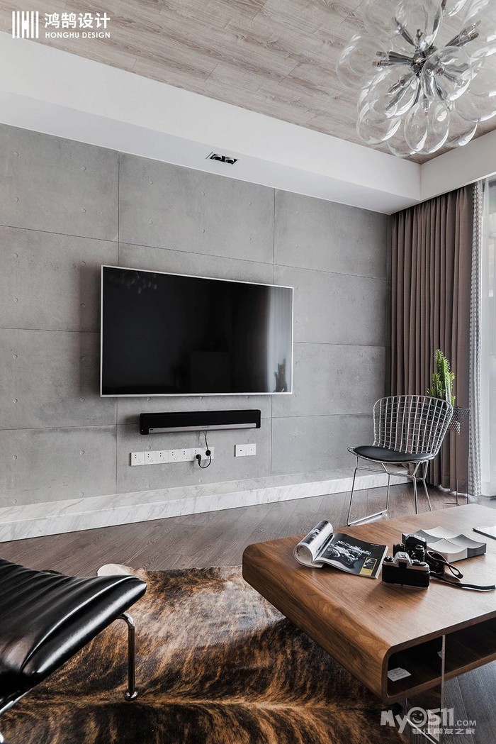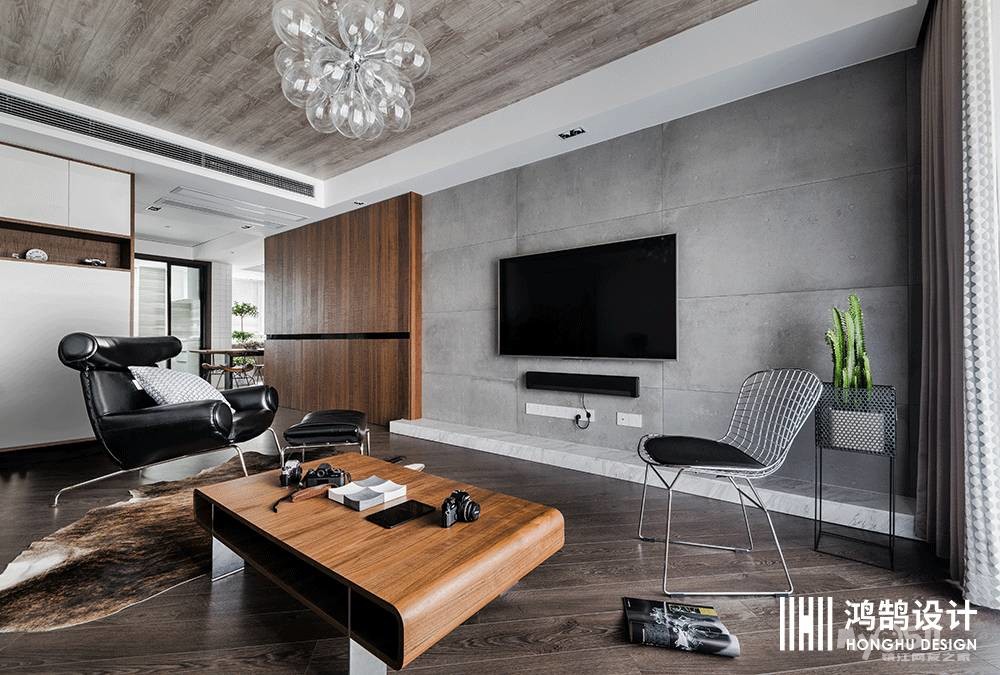 水泥墙电视背景给生活带来的真实感永远是设计师和生活爱好者们所追求的,工业风的铁艺椅子放上黑色的坐垫,简约不简单,使空间复古和现代感兼具。