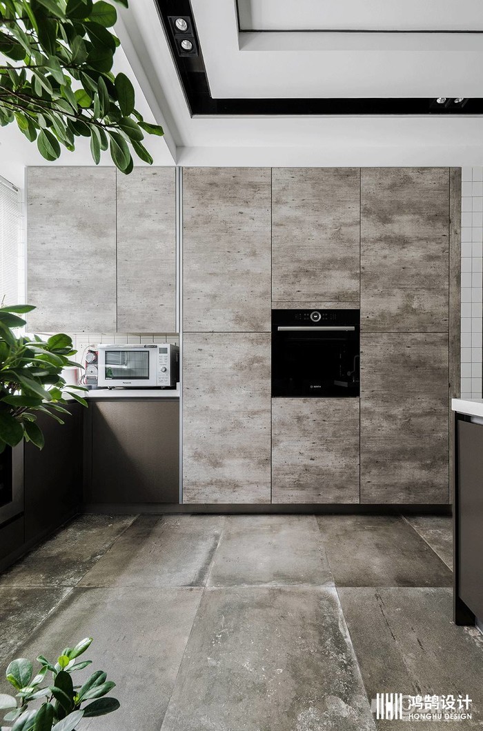 嵌入式的厨柜和烤箱是个节省空间的好办法,灰色的木纹橱柜搭配灰色的地砖增加了生活的艺术格调,绿植盆栽点缀了自然的生机。