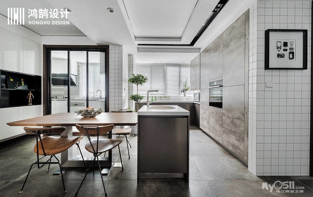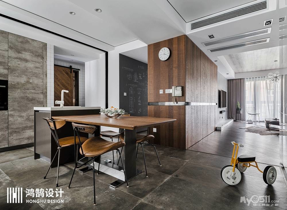 实木的铁艺餐桌与中岛吧台相连,提供更多使用的可能性,黑板墙更显文艺,白色小方砖打造自然简单的气息。