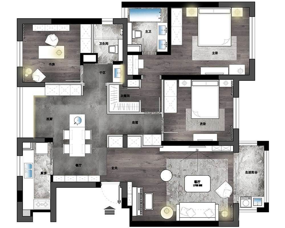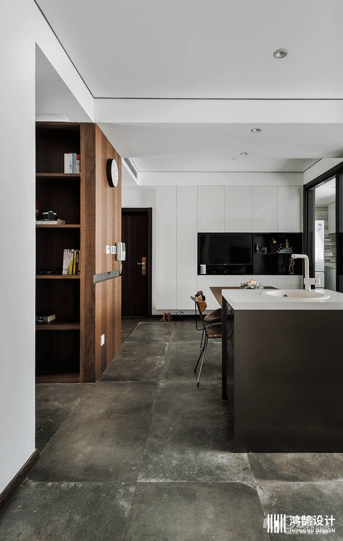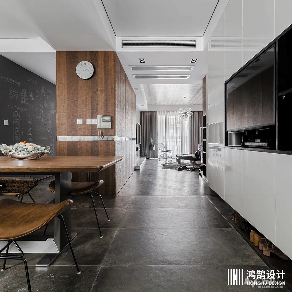 设计说明:原户型房型方正、保守,新的方案利用阳台空间、划分中西厨、使空间分工明确、缩小了中厨、扩大了就餐范围、合理的空间改造、增添了更多的储物空间。大面积的涂鸦墙,增加了小孩子的乐趣,深色地板和水泥墙,突出了工业风的元素,但同时选用皮质、金属、原木家具硬朗的空间更加精致,满足活泼的女主人和对设计上要求严谨的处女座男主人的所有要求。