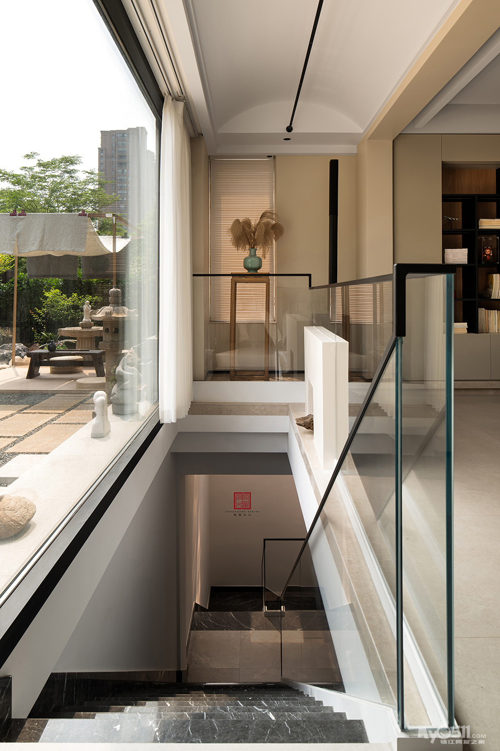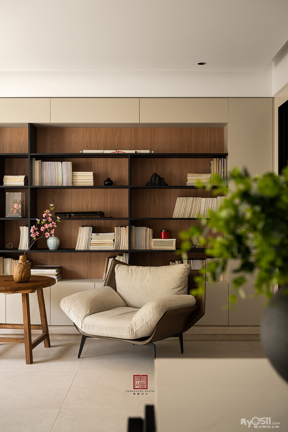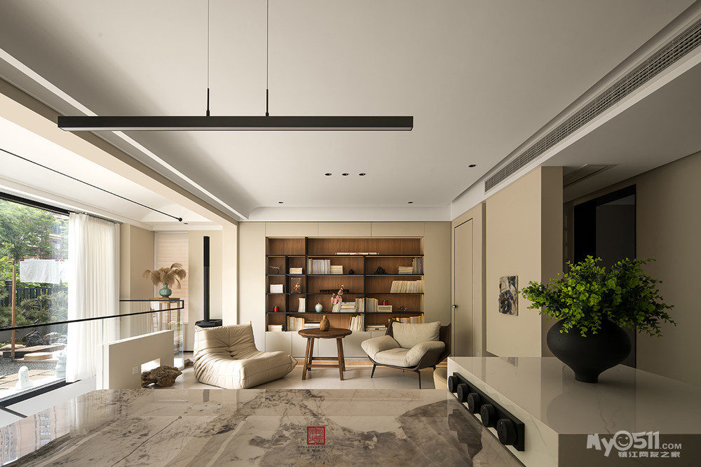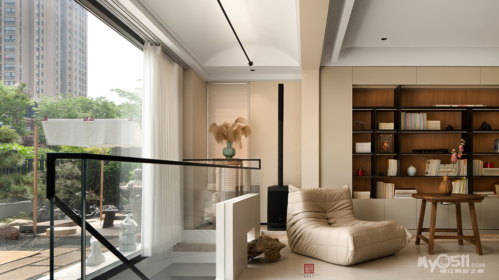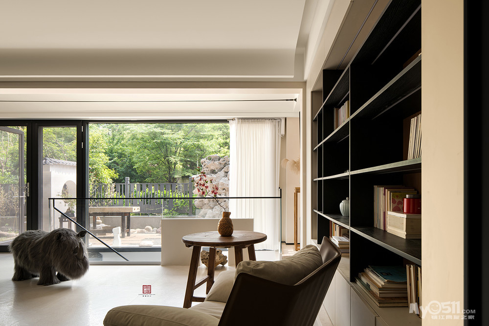 不同于常见的客厅,摆满了书籍的空间视野好极了,四季的光,影,绿,雨都像被微风带到了眼前