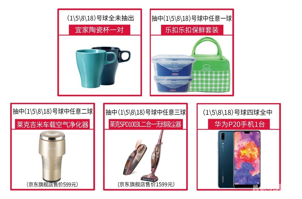 活动期间,顾客在商场购买家具建材,并至统一收银台付款,实付满6000元即可参与“心跳大乐透”活动一次,实付满26000元即可参与“心跳大乐透”活动两次,单张订单最高参与两次。博彩机内有1-20号球各一个,每轮抽奖抽出4只球,根据抽出号码获得相应礼品,最高可获得华为P20手机1台,活动期间每天限量17台,送完即止,自动降档为莱克SPD1003L二合一无线吸尘器!
