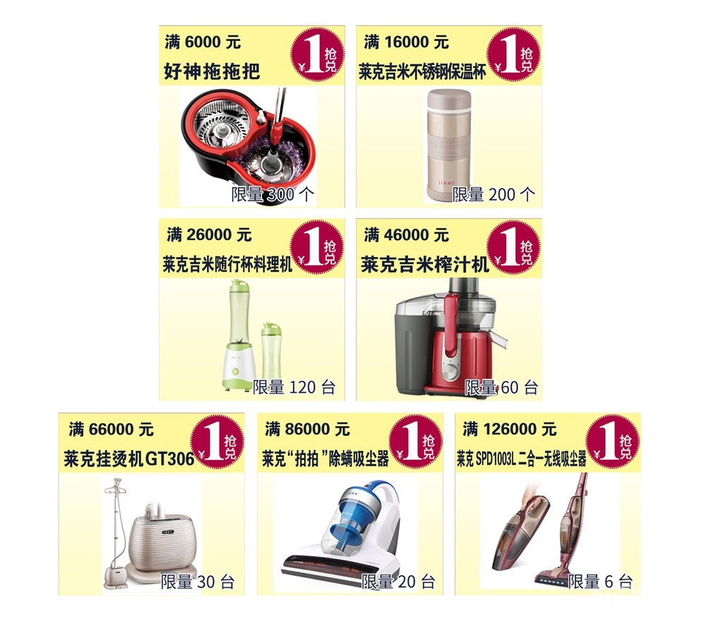 活动期间,顾客在商场购物并至统一收银台付款,实付满一定金额即可加1元抢兑相应档位的莱克潮品。各档位礼品仅限单张订单兑换,不可累积,每档礼品兑完即止,可降档至未兑完礼品。