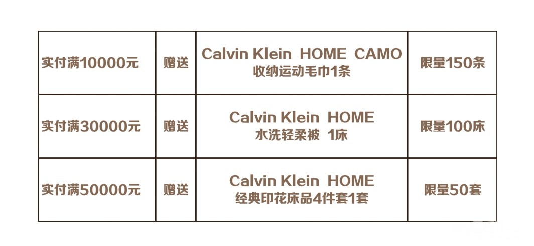 活动期间,顾客注册红星美凯龙微信会员,在商场四楼艺墅公馆购物并至统一收银台付款,根据顾客实付金额赠送相应档位的Calvin Klein潮品。(仅限单张订单领取,多张订单不可累积,相应档位不可调换)