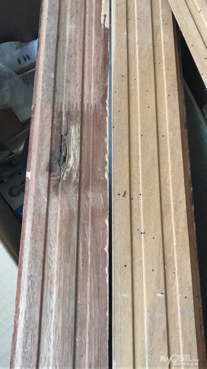 我家地板昨天铺完了,昨天顺带安装了一部分踢脚线,昨天发现一根踢脚线是烂的,已跟好美家老板娘说好回头换一根的,谁知道今天家人去现场看了发现有几根好多虫眼的,有密集恐惧症的我受不了啊