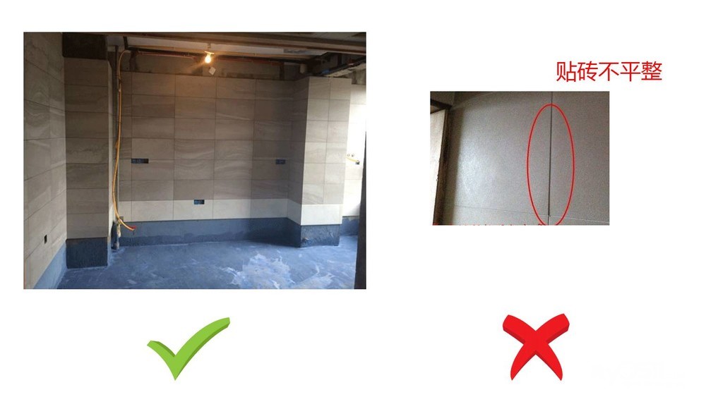 墙砖,地砖的铺贴要求是横平竖直,拼缝整齐,零空鼓,最后是用垂直的2m靠尺进行验收,误差<2mm,这样保证整体装修更加美观实用。