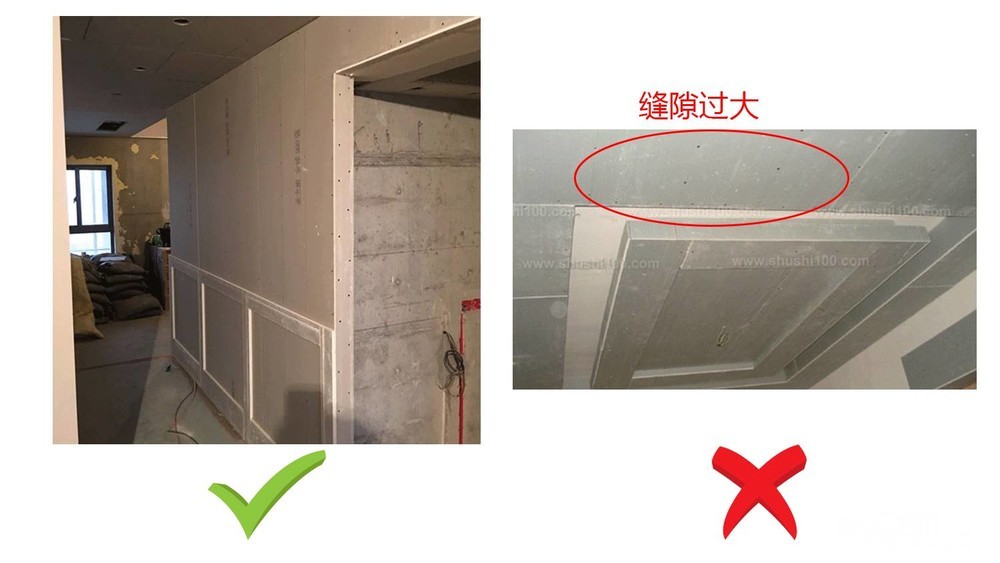 ● 石膏板固定应全部采用自攻螺丝进行固定,且板材间错位接缝并留有6-8mm的伸缩缝隙,防止石膏板膨胀伸缩,产生裂缝,自攻螺丝固定间距均匀一致,间距宜为15cm,过宽会导致板材固定不牢,容易脱落;