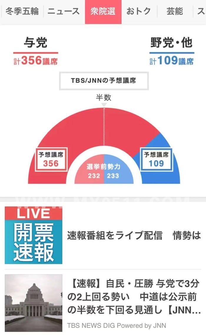 日本众院选举中,自民党已单独确保“绝对稳定多数”议席(261席)。