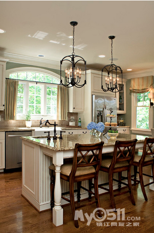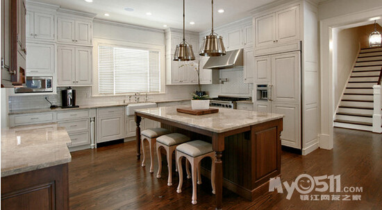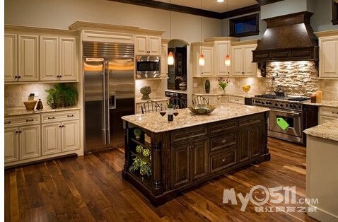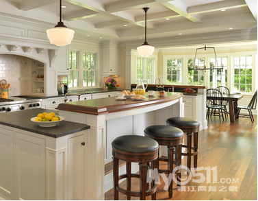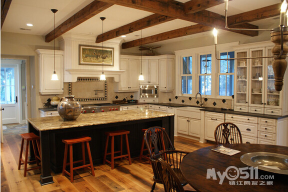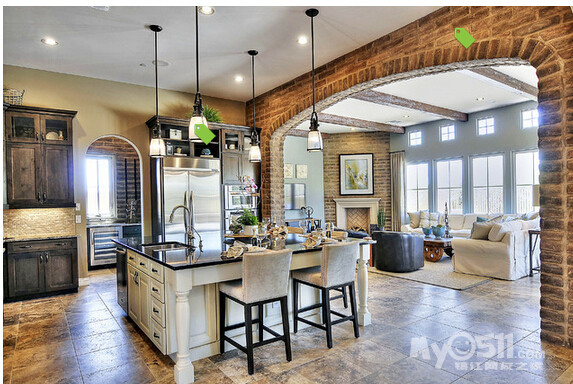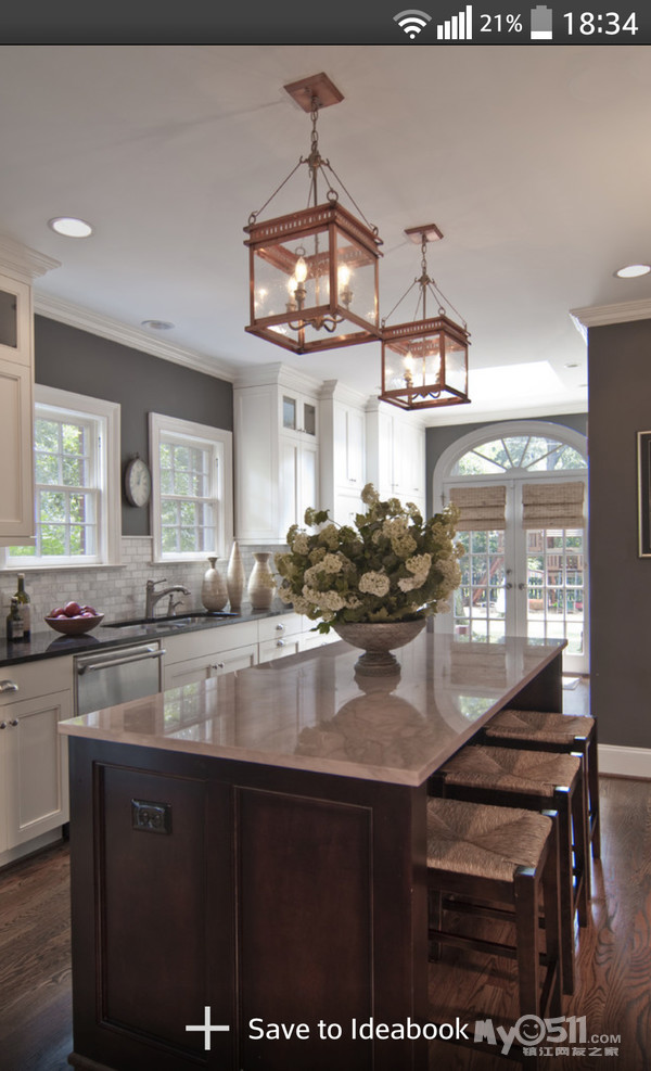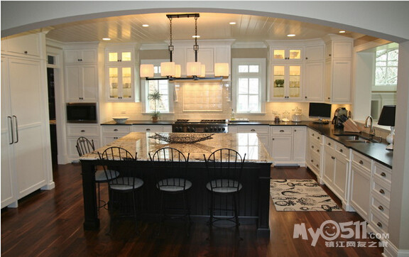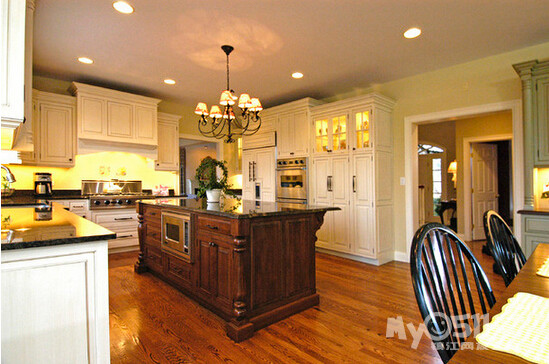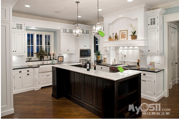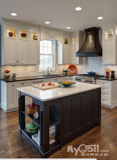 ) 这次的户型 恰巧可以满足我的心愿 而且家里烹饪习惯比较清淡 一直用的是下排式的集成灶 效果一直很好 也增加了我对开放式厨房的信心 在李静给我的三个厨房方案中 我果断的选择了 有中岛的那个 另外就是厨房的配色 看了这么多照片 初步决定是这样的 靠墙的L型橱柜 用白色红橡开放漆 台面用近似于纯黑色 最喜欢的还是杜邦亚克力那种纯黑色的 但是考虑预算 还是就选择普通的石英石最黑的那种吧 中岛使用黑色红橡开放漆 台面使用暖黄色(如果台面用白色 所有的橱柜和台面非黑即白 我感觉色调上有点冷)