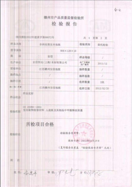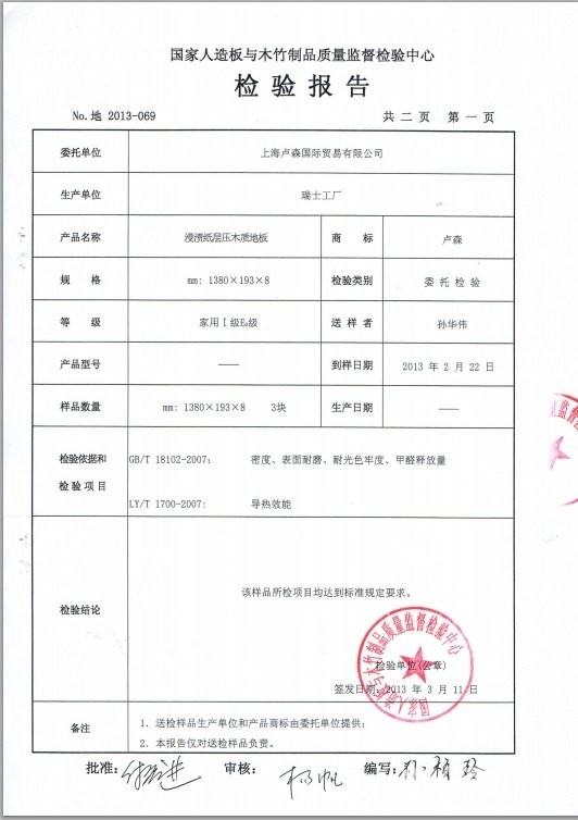 当然,也找到几份马路品牌的强化复合地板,检验报告也号称0.2mg/L。由于检验机构资质显然不如国家级的 权威,就不予考虑了。