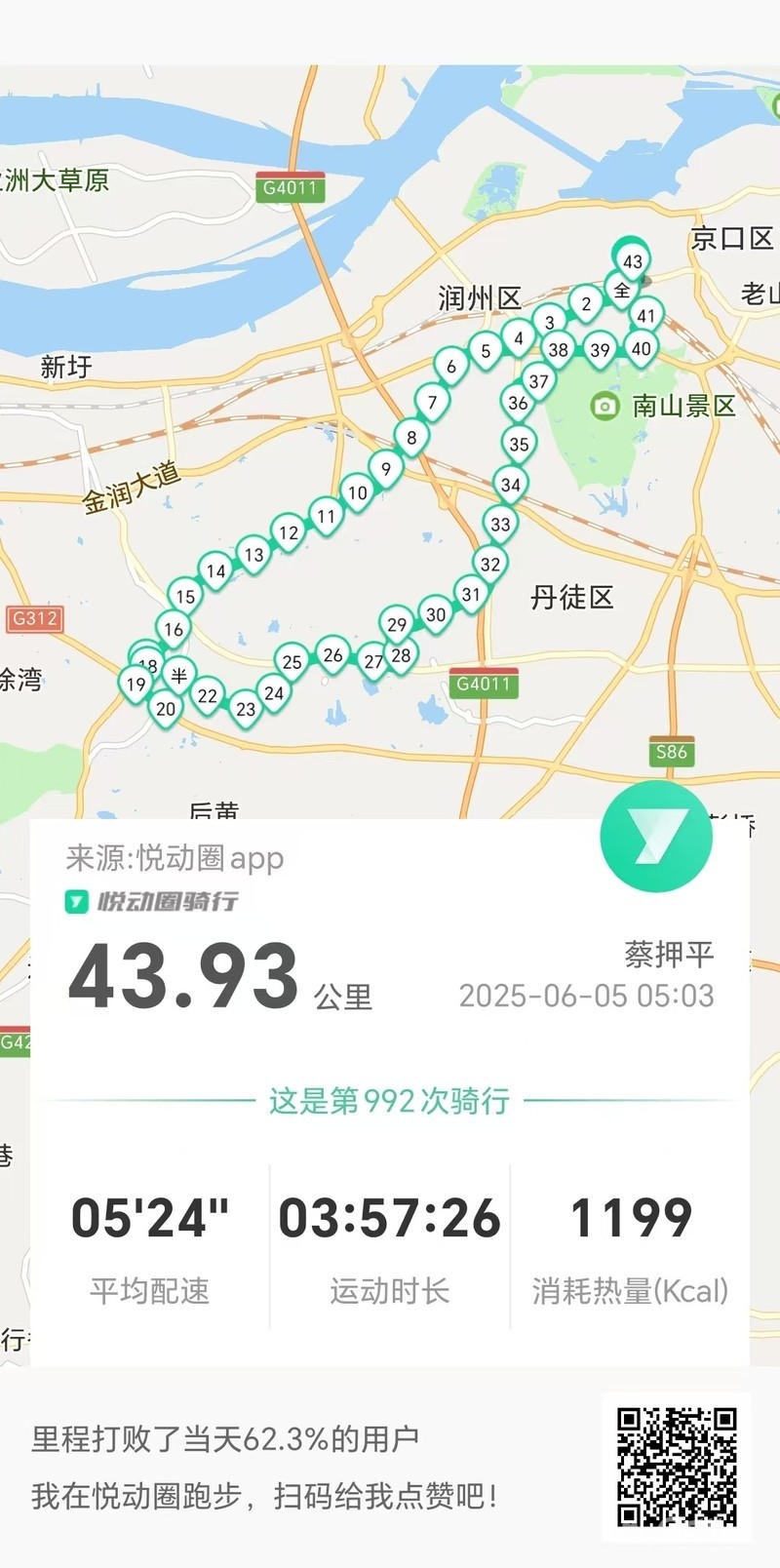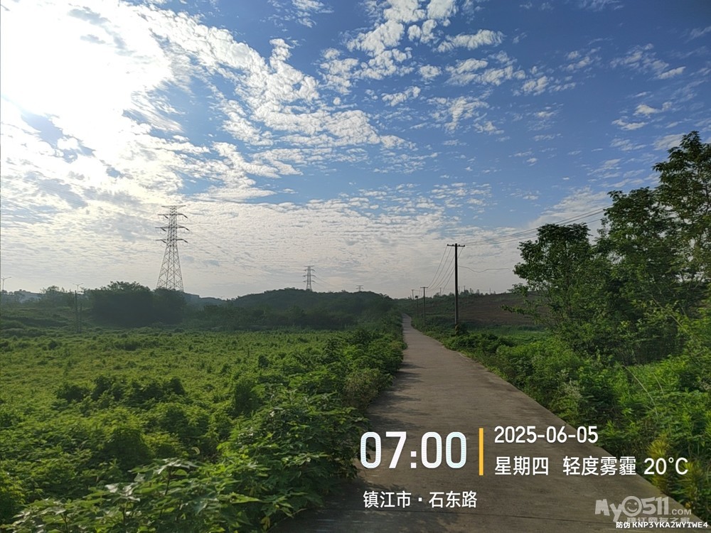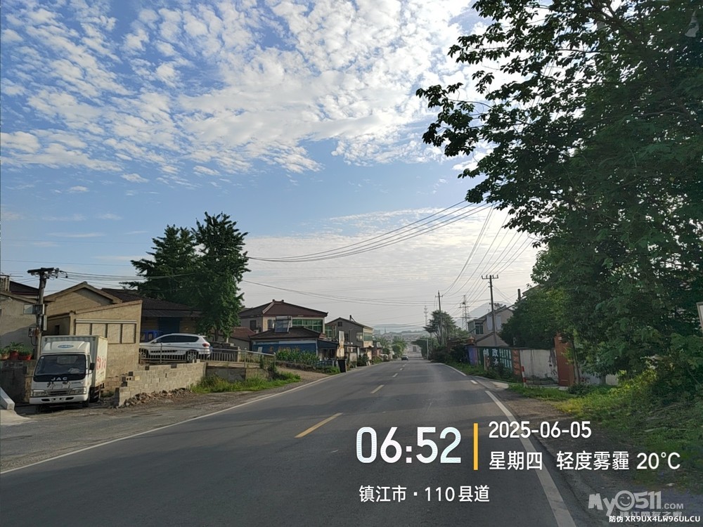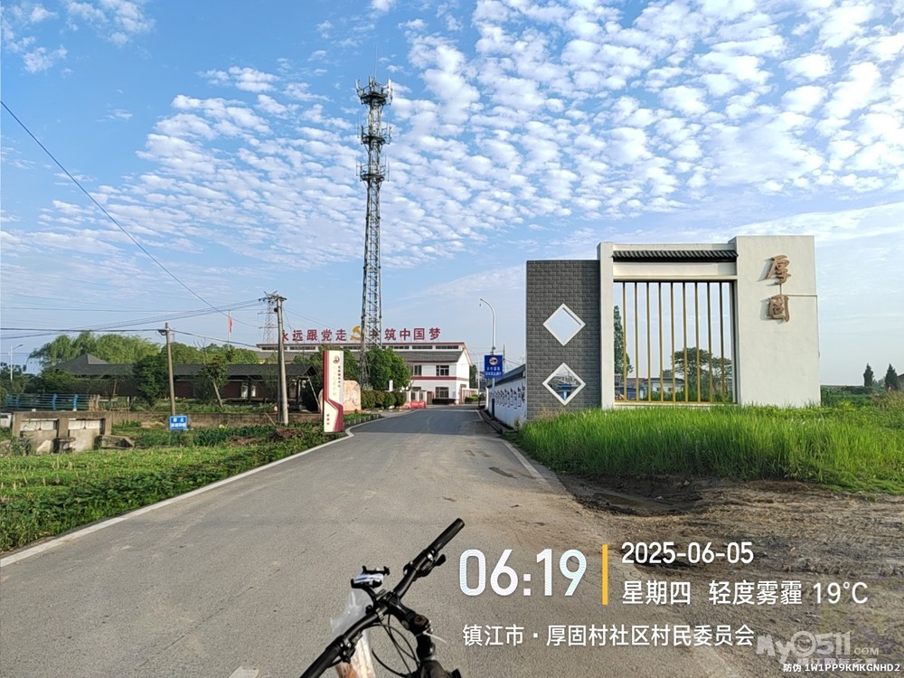 早5点3分岀发晨骑,沿健康路、北府路、檀山路、南徐大道、朱方路、乔家门路、S243、G312、110县道、石东路、文晖路、文选路、长香路、米芾书法公园、长风路、檀山路、团山路、九华山路、南徐大道、黄鹤山路、林隐路、黄山东路、健康路、仁章路,于9点平安到家。