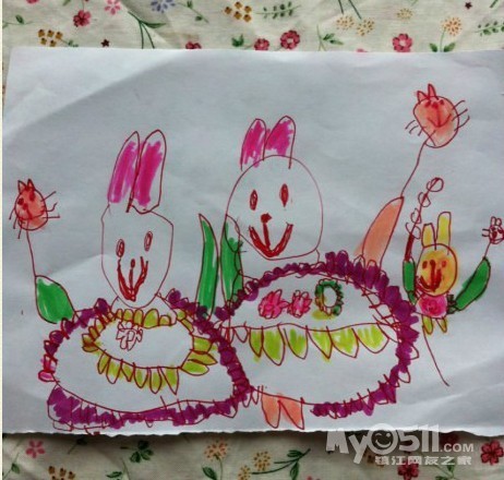 很是喜欢,构图和颜色都是媛媛自己独立完成的,(妈妈还是比较喜欢这幅画的色彩搭配的,配色比较她以前的画大胆多了,颜色也多了些许活泼)媛媛很喜欢小兔子,有时候也会把自己比喻成小兔子