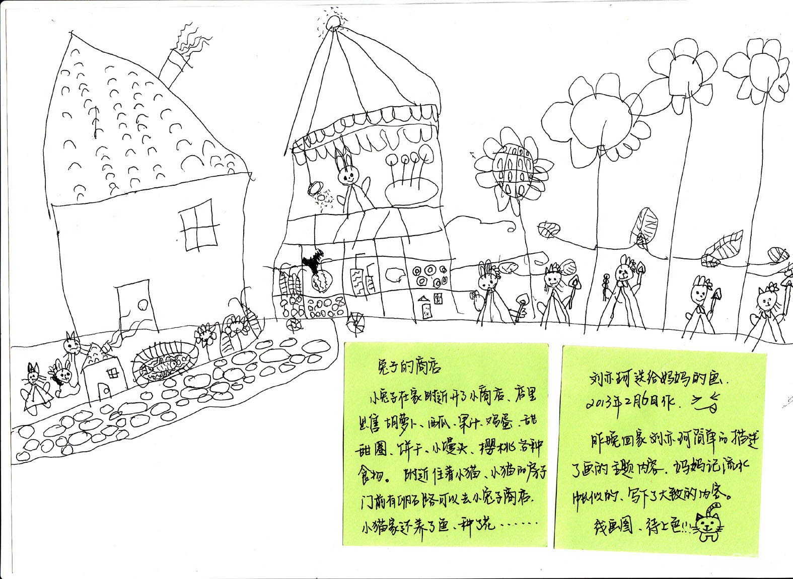 后面一只小兔子,拿着一串冰糖葫芦,表情是开心的。(她应该是把这只小兔子比喻成了自己,周末外公正好给她买了一串,这是媛媛是第一次吃冰糖葫芦。