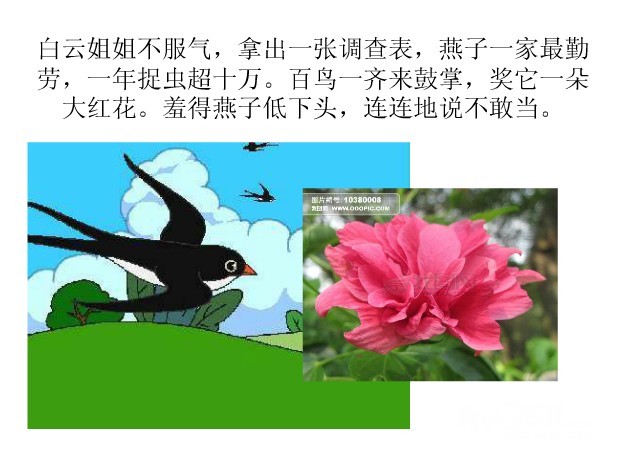 第二个是小麻雀,小麻雀飞得又稳又好,得了满分;他一蹦一跳地往前走,跳起来还真快。可是小麻雀可从来没游过泳,他在水面上低低的飞着,刚把脚伸进水里,身上的羽毛就被打湿了,一下子落在河里,幸亏小鸭游过去将他救了起来。小麻雀也没有被录取。