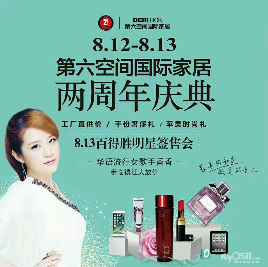 8月12日--13日,著名歌手香香与您相约镇江第六空间商场两周年!邀您一起演绎全球居家生活美学!