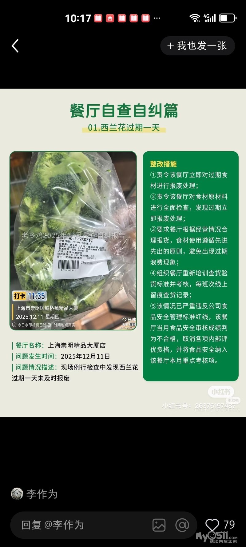 老乡鸡西兰花保质期五天,因为过了一天没做报废处理被处罚!